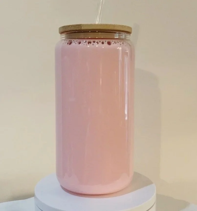 16oz glass tumbler with UV DTF wrap, featuring pink glitter with a traditional snowglobe effect. Includes bamboo lid and straw.