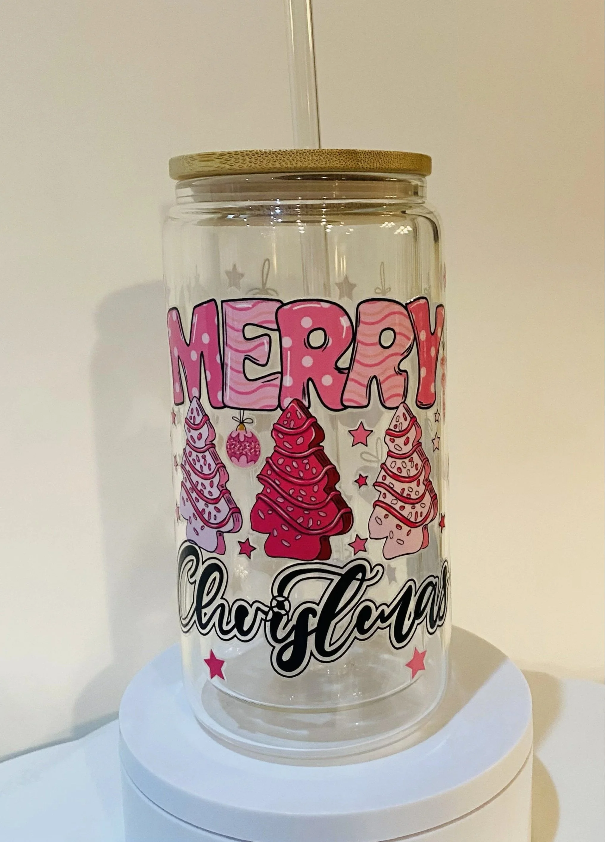 16oz glass tumbler featuring Merry Christmas cup wrap. Comes with bamboo lid and straw.