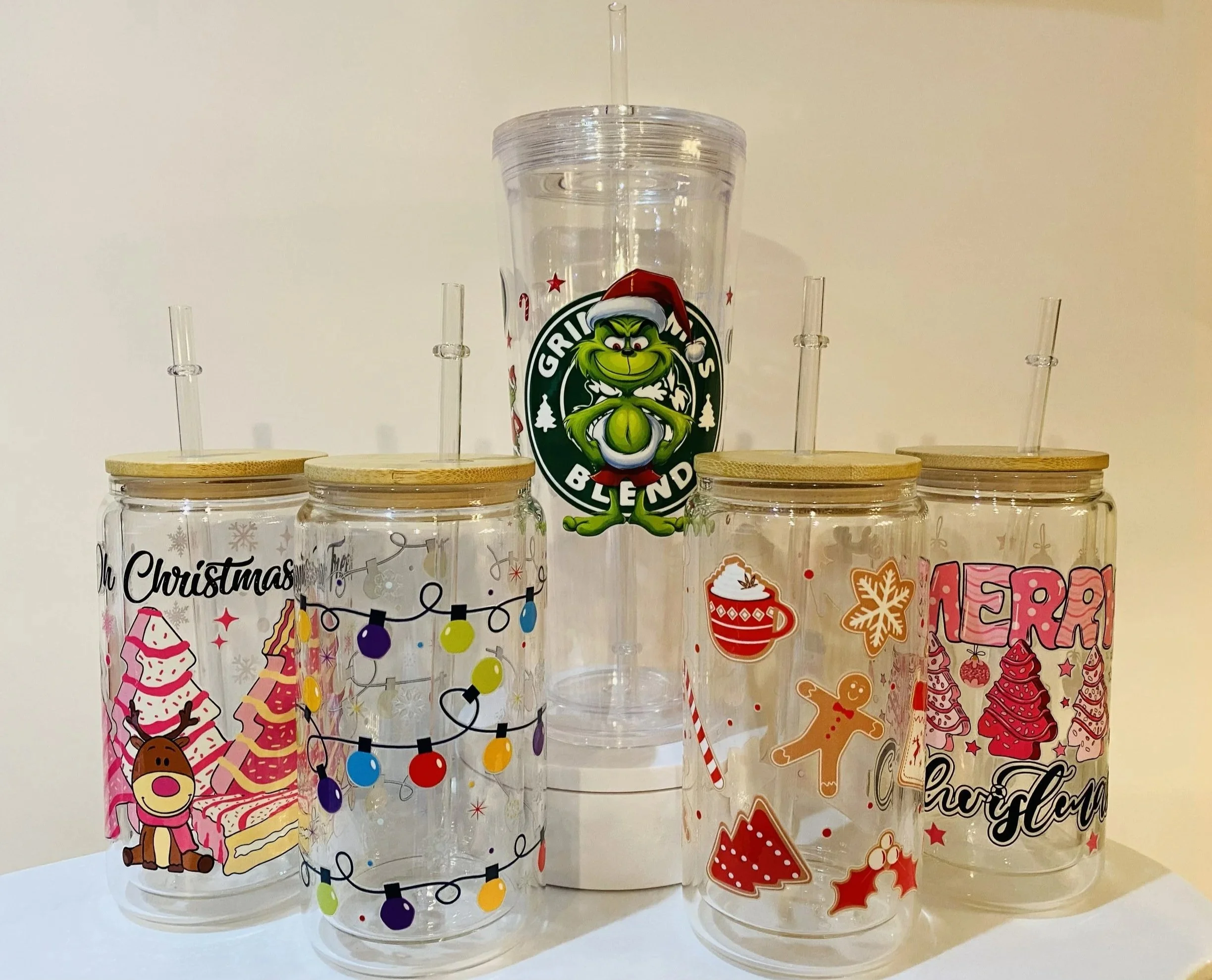 16oz glass tumbler featuring the adorable Christmas cookies cup wrap. Comes with bamboo lid and straw.